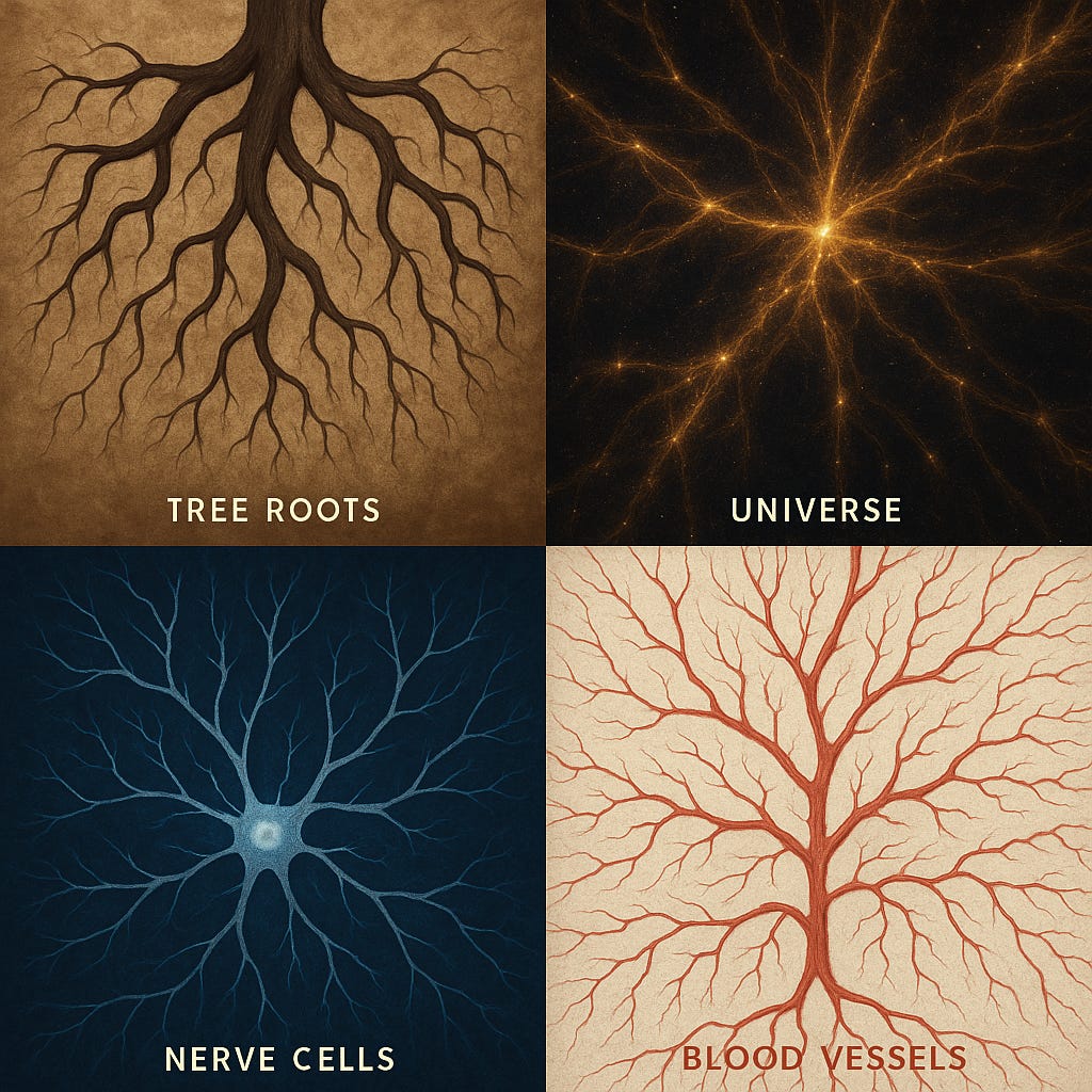 Look at a tree's roots spreading underground. Now look at a map of the universe's cosmic web. Compare that to neurons in a brain or blood vessels in your hand. The resemblance is uncanny - branching networks that look almost identical despite being vastly different in scale and substance. A galaxy cluster spans billions of light-years; a neuron fits under a microscope. Yet they share the same branching, web-like architecture. Why does nature keep using this same blueprint, from the cosmic to the microscopic?
